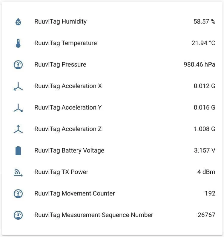 sensor:- platform: ruuvitag mac_address: XX:XX:XX:XX:XX:XX humidity: name: "RuuviTag Humidity" temperature: name: "RuuviTag Temperature" pressure: name: "RuuviTag Pressure" acceleration: name: "RuuviTag Acceleration" acceleration_x: name: "RuuviTag Acceleration X" acceleration_y: name: "RuuviTag Acceleration Y" acceleration_z: name: "RuuviTag Acceleration Z" battery_voltage: name: "RuuviTag Battery Voltage" tx_power: name: "RuuviTag TX Power" movement_counter: name: "RuuviTag Movement Counter" measurement_sequence_number: name: "RuuviTag Measurement Sequence Number"Configuration variables